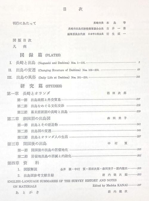 図版を収録する図録篇と、「長崎とオランダ」「鎖国期の出島図」「開国後の出島」の三章からなる論説と、収録した図版の解説及び出島図研究のための文献による研究篇にて構成。