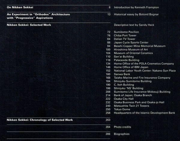 Princeton Architectural Press, 1990年, 286p, 257×260mm, hard, 英文 海外初出版となった日建設計作品集。 日建設計の作品の歩みを振り返りつつ、「Selected Works」と題し、「EXPO'85 住友パビリオン」から「パレスサイドビル」「東京ドーム」など主要作品24題を写真や図面など豊富な図版にて収録。ケネス・フランプトンによるテキストを巻頭におく。 カバーにスレ、キズ。 小口天地、ページ周縁部多少ヤケ。 その他良好。